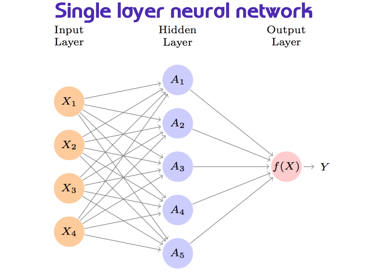 \[f(X)=\beta_0+\sum_{k=1}^K{\beta_kh_k(X)}\] \[A_k=h_k(X)=g(z)=g(w_{k0}+\sum_{j=1}^p{w_{kj}X_j})\]